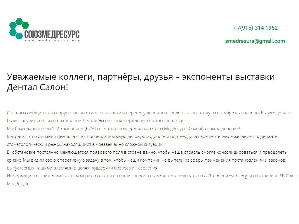 Информируем Вас о сообщении на сайте "СоюзМедРесурс" о том, что поручение по отмене выставки и переносу денежных средств на выставку в сентябре выполнено